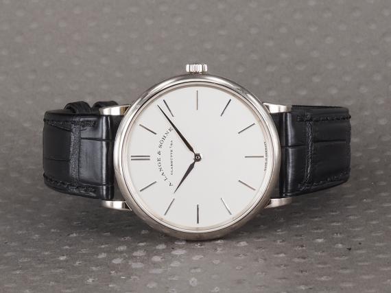 A. Lange & Söhne Saxonia Thin, ref. 201.027 from May 2017, sold from Danish authorized dealer. A classical, simple and very elegant 18 carat white gold dress watch from A. Lange and Söhne. The watch has a beautiful solid silver dial with rohdium gold index hour markers. The watch runs on a manual Cal. L093.1 movement - consisting of 167 parts - with an approximate power reserve of 72 hours. The beautiful movement can be spectated through the sapphire caseback. Comes with boxes, papers, certificate, extra strap etc.