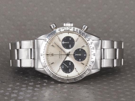 Rolex Cosmograph, ref. 6239 from approx. 1967 - 1463xxx serial number. Beautiful vintage Rolex Cosmograph. Technically, this is the first Daytona even though it does´nt have "Daytona" written on the dial as most later Cosmographs do. This is the watch that launched the Daytona legend. This 6239 has a discrete, yet elegant vintage Rolex case measuring 37mm. The case is in overall fine condition with age-related signs of usage. The watch features a T Swiss T "Cosmograph" dial, with some marks and dings at the 12 o´clock and 14 o´clock hour marker. Furthermore the dial shows age-related patina and has a few missing lume plots. The watch runs on a mechanical 17 jewel Rolex 722 movement, that is based on Valjoux 72B. This Rolex sits on a rivet bracelet, stamped 3. quarter of 1962. Comes with original Rolex strap.