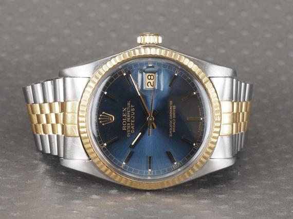 Neat Two-Tone Rolex Datejust, ref. 16013 from 1983. A fine two-tone Datejust measuring 36mm. The watch features an attractive blue dial plus bezel and crown in gold. The watch sits on a gold and steel Jubilee bracelet, with some stretch, and in absolutely wearable condition. The watch features date and quickset functions and runs on an automatic Cal. 3035 movement. Comes with AD verification.