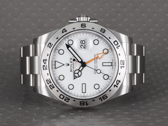 Rolex Explorer II, ref. 216570 from November 2018. A great watch from Rolex, the legendary Explorer II in the new and upgraded 42mm version. The watch is with a white dial and a non-rotating bezel in brushed steel plus the great looking, and practical orange GMT hand that gives this watch a unique look. The watch comes with boxes, papers, certificate etc.