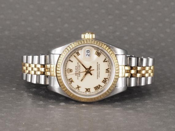 Rolex Lady Datejust, ref. 69173 from 1992, originally sold from Danish authorized dealer. The watch is made in gold and steel, and fitted with a cream color dial and fluted bezel. The watch measures 26mm and is with an automatic movement, The watch is in fine condition, with signs of normal usage. The watch comes with box, original invoice and certificate.