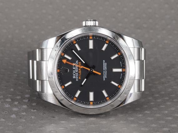Rolex Milgauss, ref. 116400, sold in February 2013. The newest version af the classic, that Rolex launched in 1965 for scientists and engineers, that needed a watch that could withstand magnetic disturbances - 1000 Gauss. The watch measures 40mm and is fitted with an automatic Cal. 3131 movement with 42 hours of power reserve. The Milgauss model is distinct and easily recognized with its clean design, the orange lightning shaped seconds hand and black contrasting dial. Comes with box, papers, certificate & extra links for the bracelet