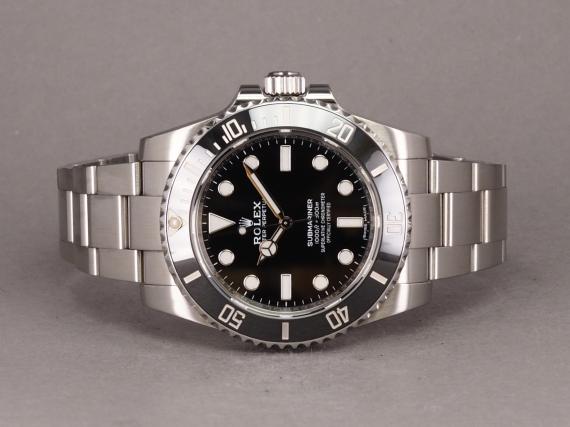 Rolex Submariner, ref. 114060 sold in June 2018. A fantastic classic, the Submariner with no date - here in the now discontinued version with maxi dial and case, white gold markers and hands and ceramic bezel. Probably the best known Rolex design. A fantastic divers watch that here comes with boxes, papers, certificate and tag etc