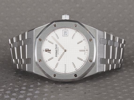 Smukt stål Audemars Piguet på 39mm og med klassisk hvid skive, der prydes af det velkendte "Petite Tapisserie" mønster, samt hvidgulds markeringer. Uret sidder monteret på den flotte AP lænke, som er kendt for sin gode bærekomfort og elegante design.