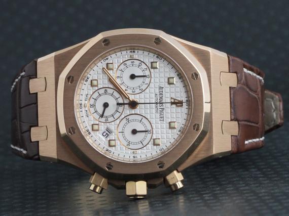 Top lækker Audemars Piguet Royal Oak Chrono 39mm i 18K guld. Uret er netop tjekket og poleret hos Klarlund i København og kommer med en helt ny original AP krokorem.