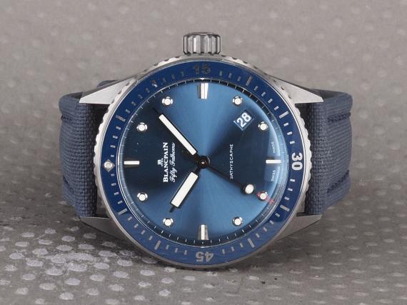 Fantastisk lækkert 43.6mm Blancpain udført i kermaisk materiale, hvilket giver uret flot look. Uret er med safirglas samt en blå sunburst skive med dato visning. Endvidere tilbyder uret en roterbar keramisk krans, samt safir bagkasse der giver mulighed for at betragte urværket.
