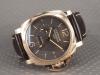 Lækkert 44mm Panerai Luminor med . Kassen er fremstillet i Panerais Goldtech legering, som adskiller sig fra almindeligt guld, ved også at indeholde kobber. Uret har en flot brun skive med datovisning, GMT funktion, 24-timers visning og powereserve indikator. Uret sidder på en brun aligatorrem med guld Panerai spænde.