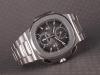 Travel Time Kronograf modellen fra Patek Philippe Nautilus linjen, her med sort skive der udover dato funktion, har en kronograf subdial placeret over kl 18 der indikerer minut tidstagning. Desuden har uret dag/nat indikator samt local og home time.
