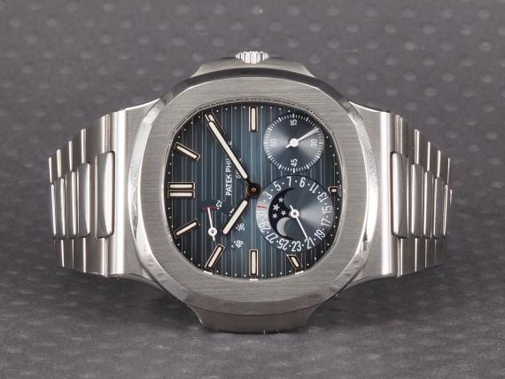 Måne fase modellen i Nautilus linjen, her med smuk blå skive der udover måne fase funktion, byder på small seconds, dato samt gangreserve indikator.