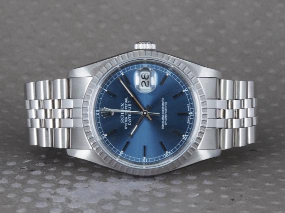 Klassisk Rolex Datejust på 36mm udført i stål med en flot blå skive. Uret fremstår generelt i meget flot stand og sidder monteret på en fin Jubilee lænke med let stræk.