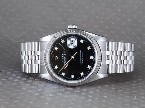 Dette Datejust måler 36mm og er udført i stål og monteret med en flot sort diamant skive. Endvidere er uret med en flot lynette af 18k hvidguld samt safirglas.