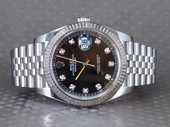 Dette flotte eksemplar repræsenterer den seneste 41mm udgave af den velkendte og klassiske Datejust model. Uret har en flot og elegant sort diamant skive samt en riflet hvidgulds lynette. Generelt er uret i rigtig fin stand og sidder på en Jubilee-lænke. Låsen på lænken er udstyret med et genialt extension led, der gør det muligt at justere spændet med 5 mm.