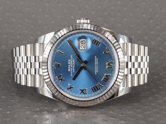 Lækkert eksemplar af den seneste 41mm udgave, af den velkendte og klassiske Datejust model, her med flot og elegant blå skive, samt riflet hvidgulds lynette. Uret har så godt som ingen brugsspor, og sidder på en Jubilee lænke uden stræk. Låsen i lænken er med et geniale extension link, der gør det muligt at justere spændet 5mm.