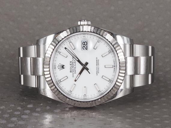Lækkert eksemplar af den seneste 41mm udgave, af den velkendte og klassiske Datejust model, her med flot og elegant hvid skive, samt riflet hvidgulds lynette. Uret sidder monteret på en Oyster lænke uden stræk. Låsen i lænken er med et geniale extension link, der gør det muligt at justere spændet 5mm.