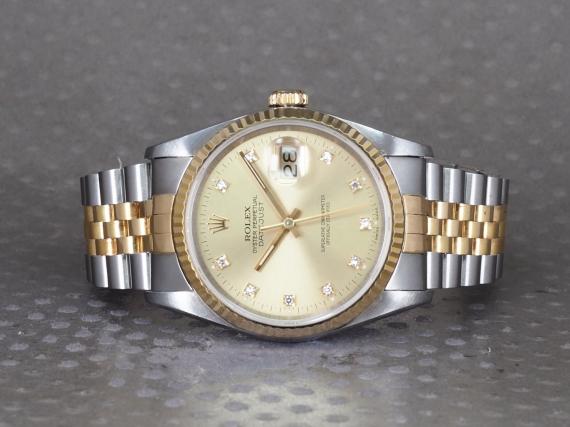 Klassisk og smukt Datejust i 18K guld og stål. Uret måler 36mm er med safirglas, automatisk optræk og en flot diamant-besat skive med romertal, samt riflet guld lynette.