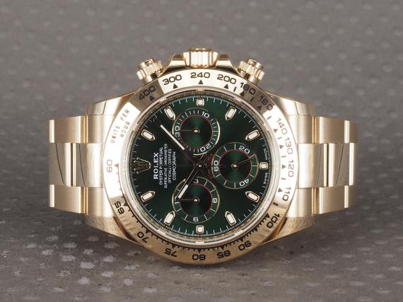 Den velkendte Rolex kronograf Daytona, her udført i 18K guld, udstyret med grøn skive med grønne subdials, samt guld Oyster lænke med Oysterlock safety clasp med Easylink, der gør det muligt at mikrojustere spændet.