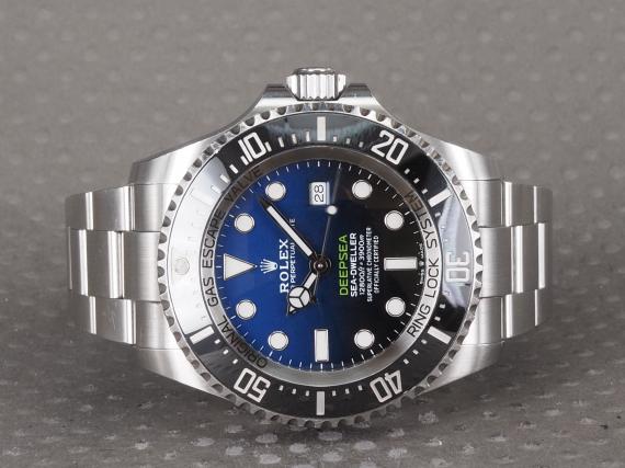 Den nyeste og super populære Deepsa Sea-Dweller, her i versionen D-Blue, der med sin blå og sorte skive giver et anerkendende nik til James Camerons solodyk. Fra den lyse blå til den mørke farve, som symboliserer Camerons dyk til bunden af Mariana Trench. Denne model blev introduceret på Basel 2018. Af opgraderinger fra den forgående model, kan bla nævnes det nyere COSC certificerede Cal. 3235 værk der holder en gangreserve på 72 timer. Uret måler stadigvæk 44mm, men har fået lidt nye dimensioner så kassen integreres bedre med lænken. Låsen byder nu osse på både Fliplock og Glidelock.