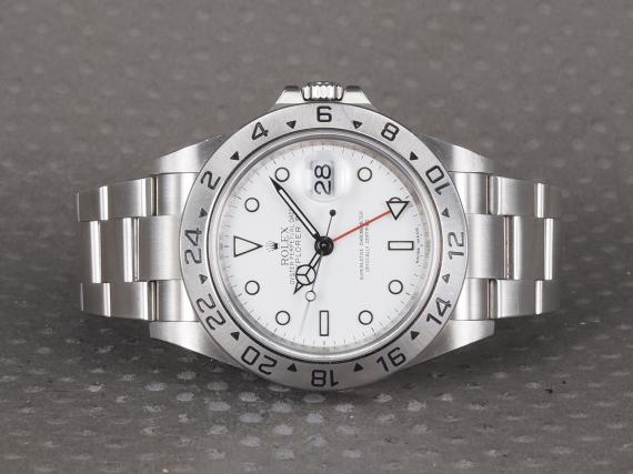 Lækkert 40mm Explorer II med hvid skive. og RRR gravering. Uret fremstår overordnet i pæn stand med normale brugsspor på kasse og lænke. Uret er med det opgraderede Cal 3186 værk.