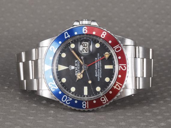 Dette GMT er med mat skive, som fremstår med lys cremefarvet patina. Viserne har en nuance mørkere patina end skiven og ligeledes let korrosion. Uret sidder på en 78360 lænke i pæn stand. Et godt eksemplar af det klassiske og eftertragtede GMT-Master.