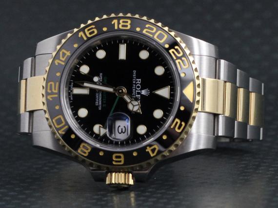 Rolex GMT-Master II G/S 116713LN, den seneste udgave af GMT-masteren i guld og stål. Uret måler 40mm og er med automatisk optræk. Det er i meget fin stand og kommer komplet fra dansk forhandler, solgt i 2013.