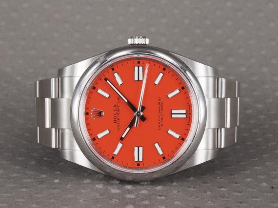 Klassisk og enkelt Rolex på 41mm, her med en super flot Coral Red skive. Uret er med et automatisk Caliber 3230 værk, der yder en gangreserve på ca. 70 timer og en præcision på +2/-2 sekunder i døgnet.