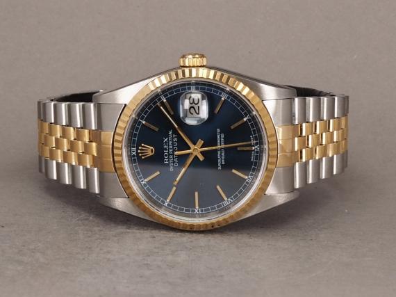 Lækkert eksemplar af den klassiske 36mm Datejust, her i guld og stål modellen med en flot blå skive, der giver uret et smukt look.